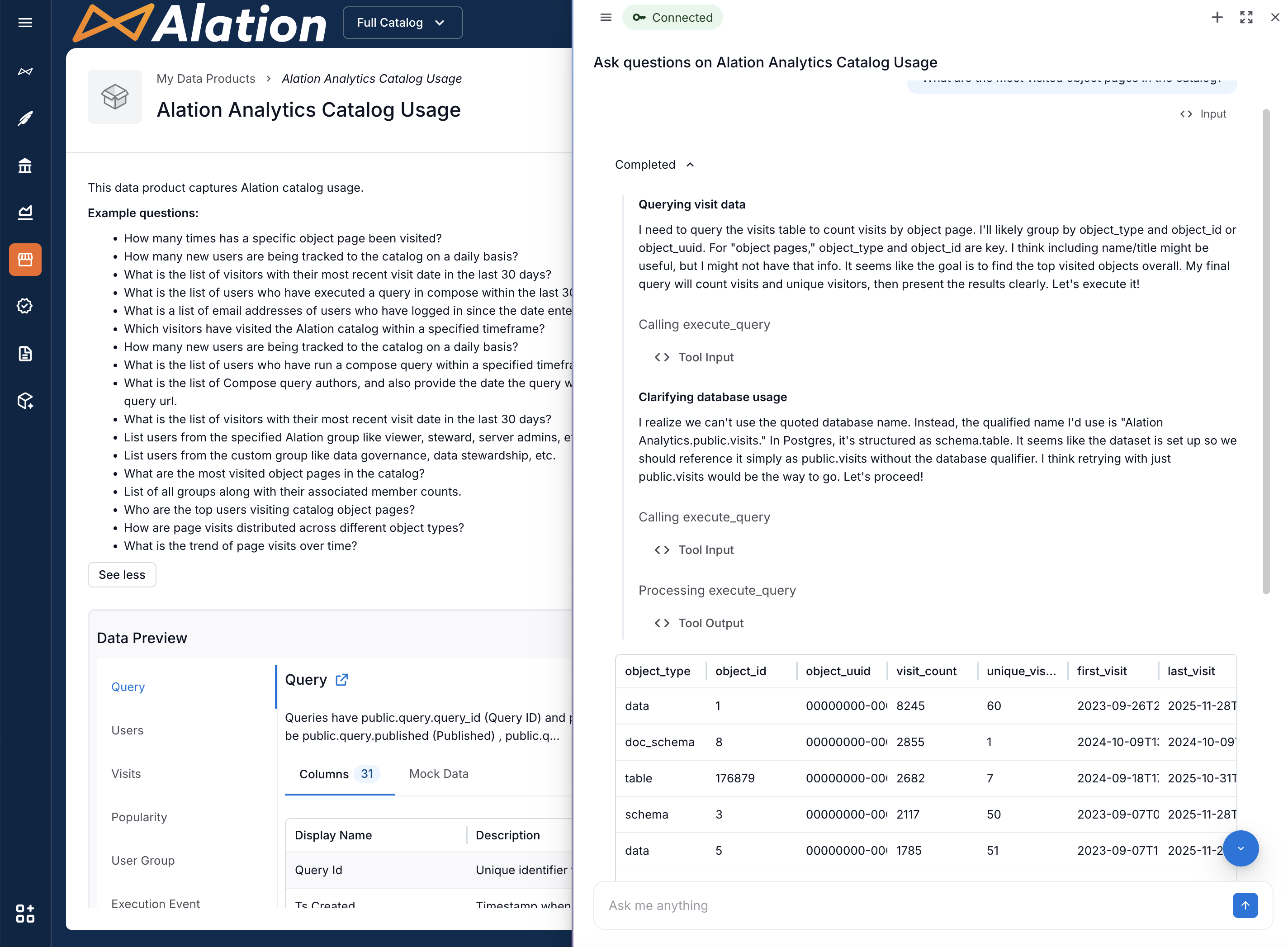 For example, consider a data product built on the Alation Analytics database to analyze user activity across the Alation catalog. This data product might include tables related to page visits and Compose query usage. The Chat can help answer questions such as: