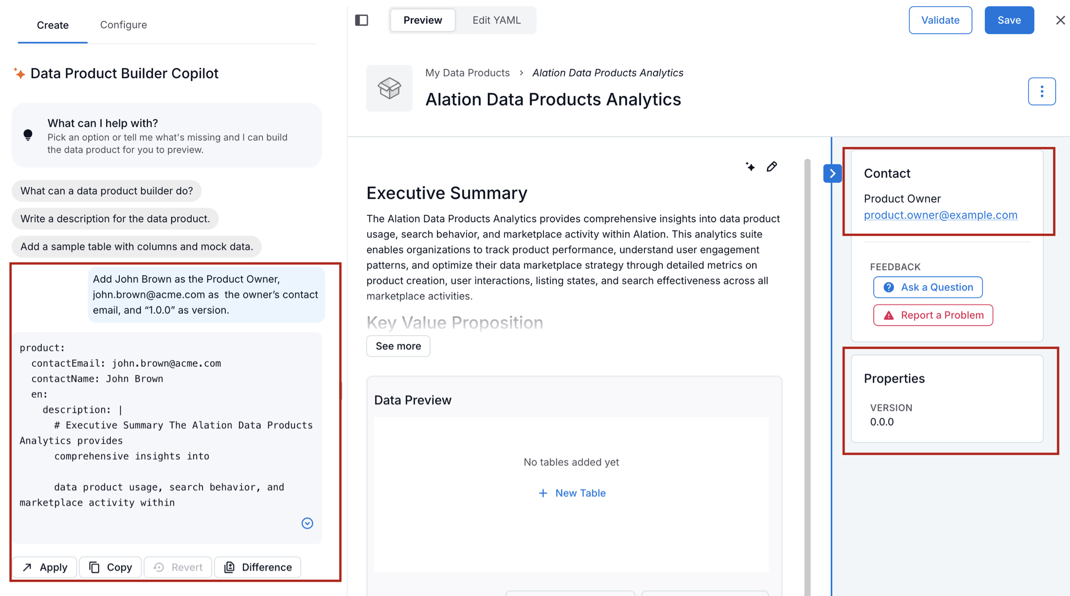 We’ll use the Data Products Builder Copilot to populate the owner-related fields.