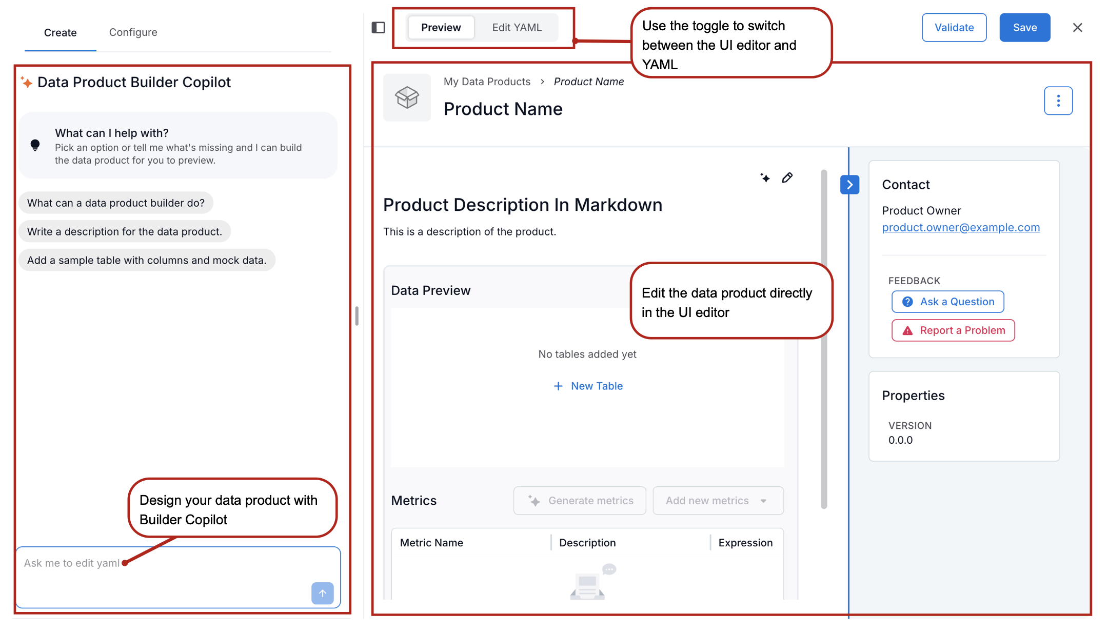 Edit YAML: Lets you view and edit the underlying YAML schema that defines the data product. Click Edit YAML to view the YAML specification of the data product.