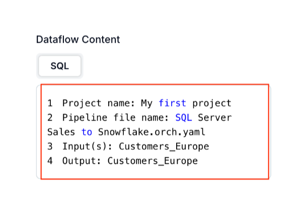 The actual SQL is not available in the dataflow content, instead, it will display the Project name, Pipeline file name, input(s) and output.