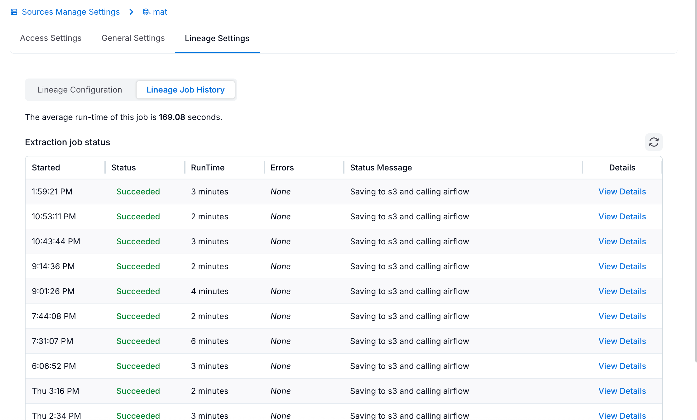 Go to Lineage Settings > Lineage Job History tab to view the status of the extraction duration, errors, and details of lineage paths extracted by the connector.