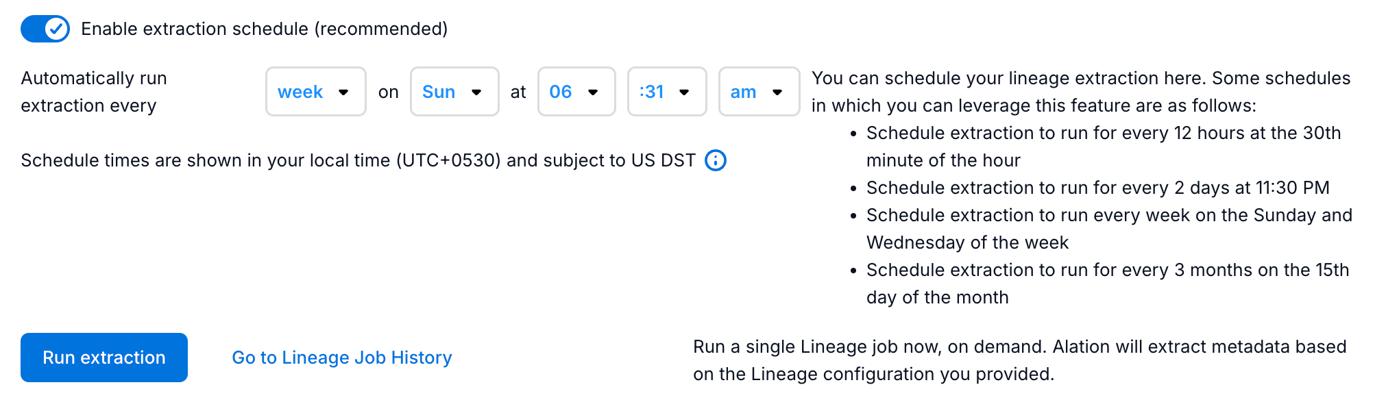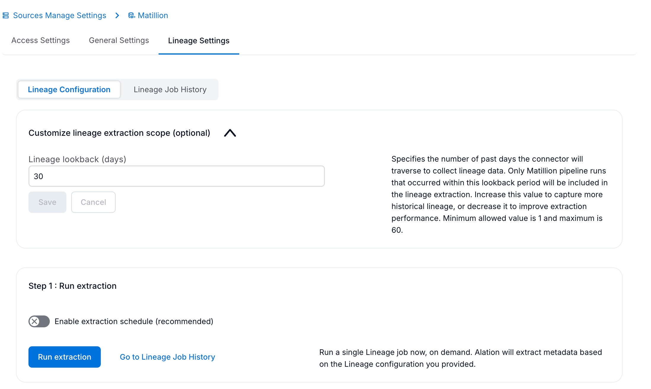 Under the Run extraction section (Lineage Settings > Step 1: Run Extraction), click Run Extraction to extract lineage metadata on demand.