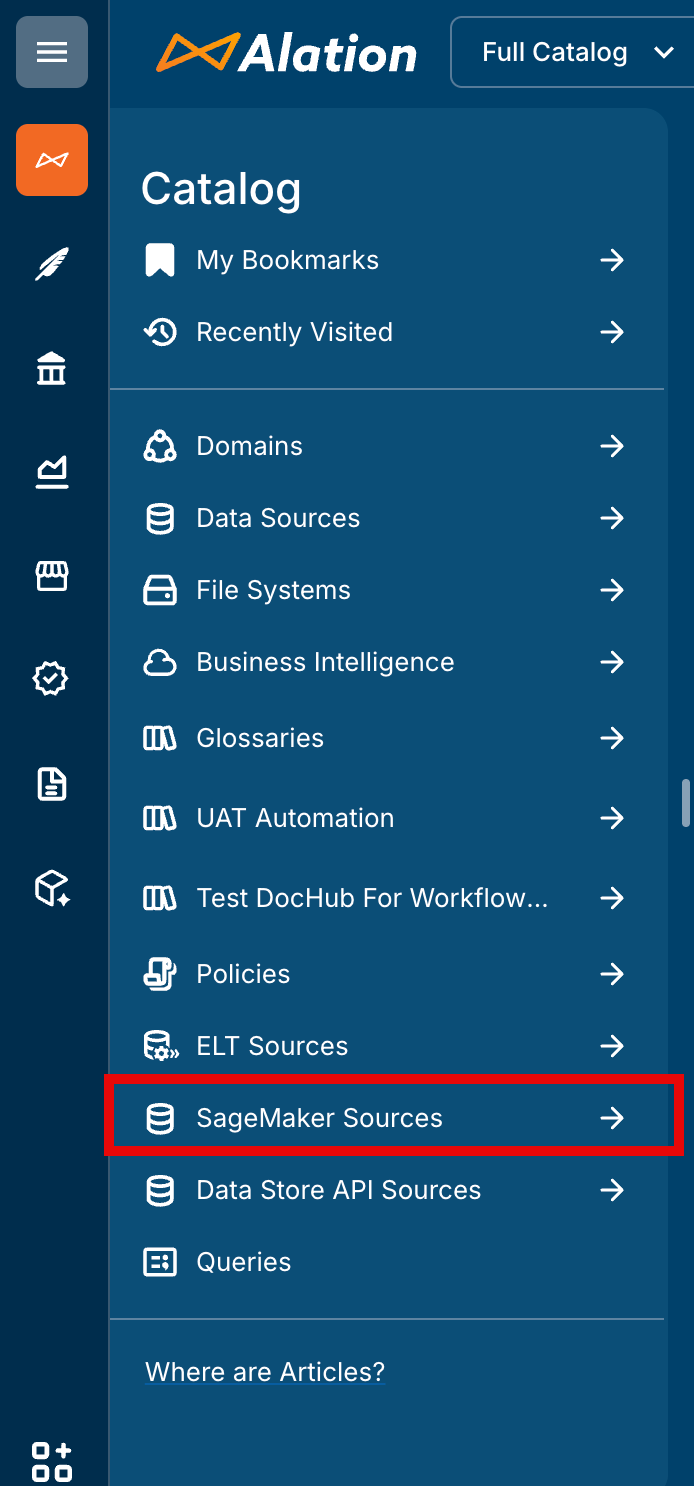 Once the feature flag is enabled, the SageMaker source type will be available in Alation for creating SageMaker sources.