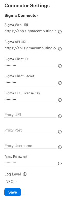 Specify the proxy server password. This optional field should be used only if the Sigma OCF connection occurs over a proxy. This field should be left blank for Alation Cloud Services customers. |