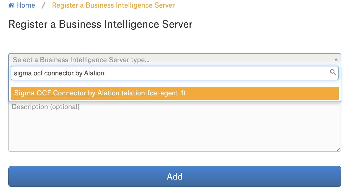 On this screen, from the Select a Business Intelligence Server type list, select the Sigma OCF Connector by Alation connector name.