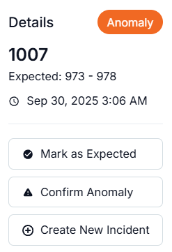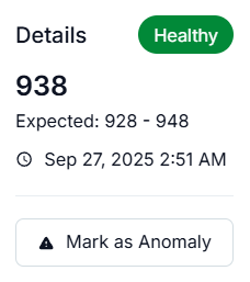 Warmup Period: When an anomaly metric is assigned, it enters a 30-day warmup period. During this time, the model analyzes historical patterns to learn your data’s normal behavior, seasonality, and expected variation. No alerts are generated during this phase.