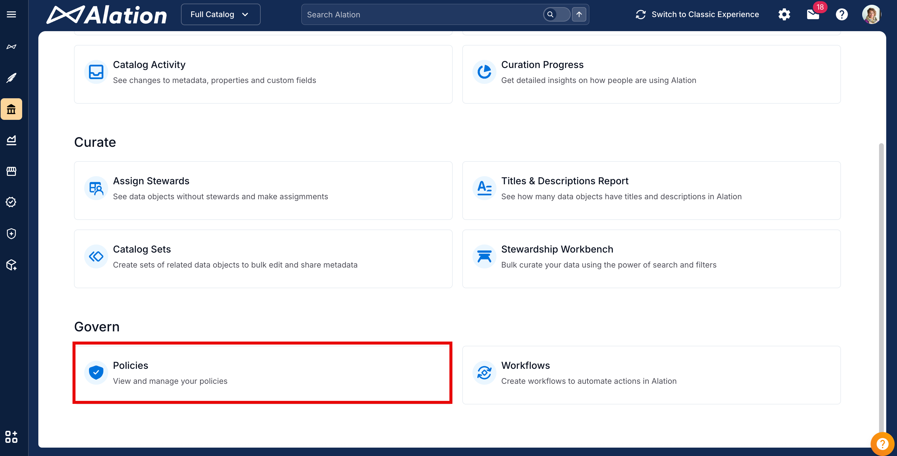 After you enable it, the Policy Center icon appears under Curate and Govern > Govern.